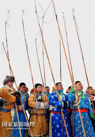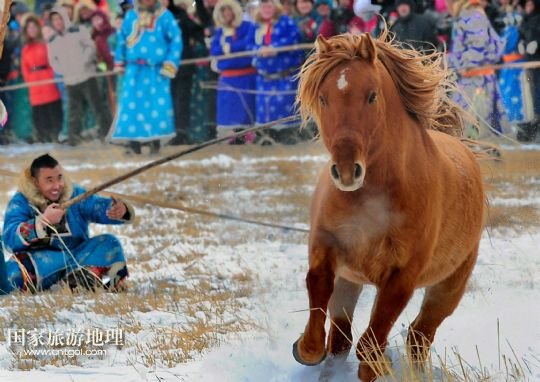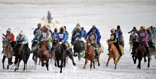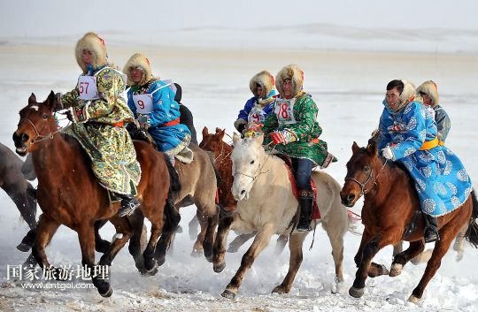 國家旅游地理 內(nèi)蒙古錫林郭勒1月5日訊 1月4日,牧民們在賽馬比賽中。當(dāng)日,2014年“銀色西烏珠穆沁”杰仁馬文化節(jié)在內(nèi)蒙古錫林郭勒盟西烏珠穆沁旗舉行。當(dāng)?shù)孛晒抛迥撩裆碇A麗的服飾,帶著自家的馬匹,冒著風(fēng)雪嚴(yán)寒,從四面八方趕到會場,參加了賽馬、套馬、乘馬拾物、蒙古馬選美等多項(xiàng)比賽,吸引了來自全國各地的游客、攝影愛好者以及附近的大批牧民。 /新華社記者任軍川攝