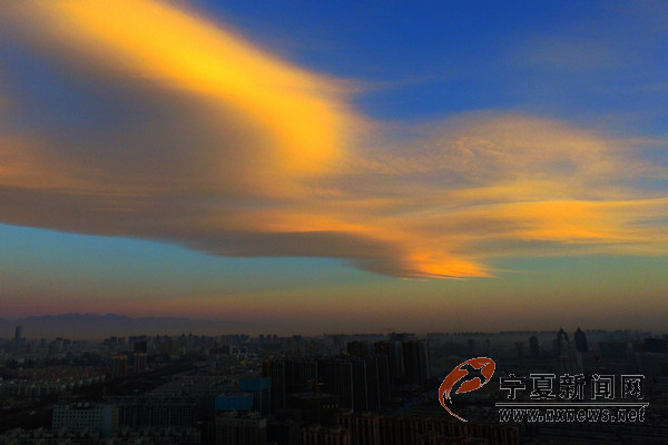 12月26日8時(shí)10分許,銀川上空出現(xiàn)奇云,宛如一只展翅飛翔的鳳凰浮于銀川西邊天空,伴著初升的朝陽(yáng)與巍峨的賀蘭山為伴,格外美麗。 寧夏新聞網(wǎng)記者 祁瀛濤 攝